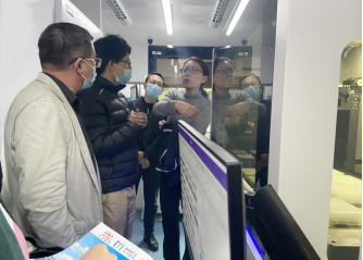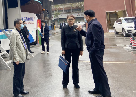 湖北省衛(wèi)生健康委醫(yī)政醫(yī)管處處長朱洪波(左一)參觀武漢光谷?核酸檢測車